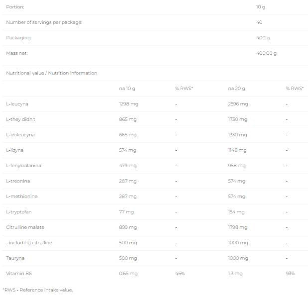 Ingredients: L-leucine, L-lysine, L-threonine, flavors, L-valine, L-isoleucine, L-arginine, citric acid, L-methionine, L-phenylalanine, L-histidine, L-tryptophan, rice starch, sucralose, silicon dioxide, dye (E124).