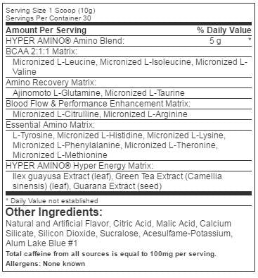 Directions: Mix 1 scoop of HYPERAMINO with 4-10oz. (120-300ml) of water, juice or your favorite beverage. Stir in a glass or shaker. Do not exceed 3 servings in a 24 hour period.