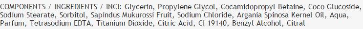 INGREDIENTS/INGREDIENTS/INCI: Glycerin, Propylene Glycol, Cocamidopropyl Betaine, Coco Glucoside, Sodium Stearate, Sorbitol, Sapindus Mukurossi Fruit, Sodium Chloride, Argania Spinosa Kernel Oil, Aqua, Parfum, Tetrasodium EDTA, Titanium Dioxide, Citric Acid, CI 19140, Benzyl Alcohol, Citral