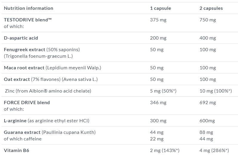 Ingredients: d-aspartic acid, maca root extract, fenugreek, zinc, l-arginine, guarana extract, vitamin B6