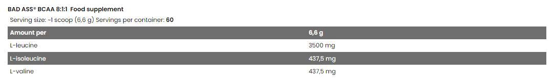 Bad Ass BCAA 8:1:1 offers a powerful combination of branched chain amino acids with an emphasis on Leucine, which is a key element for optimal muscle recovery and growth. The 8:1:1 ratio (Leucine:Valine:Isoleucine) has been shown to activate anabolic mechanisms in the body, leading to better training results and recovery.