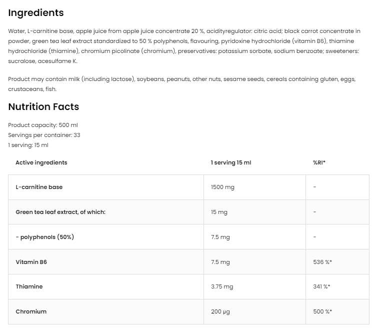 L-Carnitine Liquid is a unique product that combines the powerful properties of L-carnitine, green tea and chromium to provide you with an effective solution for weight loss and improving physical endurance. L-carnitine plays a key role in the transport of fatty acids to the mitochondria, where they are burned for energy. Green tea is known for its antioxidant properties, which help fight free radicals, while chromium helps regulate blood sugar levels, which is especially important for appetite control. Scientific research supports the benefits of L-carnitine, showing that it can increase fat burning and improve physical performance. Green tea has also been linked to increased metabolism and weight loss, and chromium can reduce food cravings, especially for sugary substances. It is important to note that individuals with known medical conditions or those taking medication should consult a physician before using the product. It is not recommended for pregnant or breastfeeding women. For the best shopping experience, Feel You offers excellent prices and quality products that meet high standards for safety and effectiveness. Shop with confidence and take advantage of special offers. **Don't forget to look at the second product photo for the full product ingredients!**