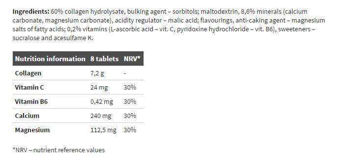 Dietary supplement with collagen hydrolysate - citrus flavored chewable tablets - with sweetener.