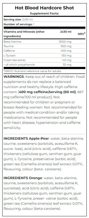 SCITEC Hot Blood Hardcore Shot je silný předtréninkový doplněk, který vám pomůže posouvat vaše limity a dosáhnout nových výšin v posilovně. Díky svým unikátním složkám, včetně kofeinu a extraktu ze zeleného čaje, tento produkt poskytuje optimální dávku energie a antioxidační ochranu. Beta-alanin, tyrosin a taurin ve složení hrají také důležitou roli při zvyšování síly a energie během tréninku. Vědecké studie ukazují, že kofein může zvýšit fyzickou výkonnost a zvýšit intenzitu tréninku. A extrakt ze zeleného čaje je známý svými prospěšnými vlastnostmi pro metabolismus a energetickou rovnováhu.