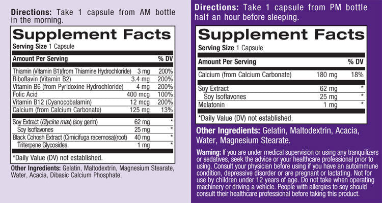 Navrženo tak, aby pomohlo zmírnit příznaky spojené s menopauzou, Natrol Complete Balance® Menopause AM/PM obsahuje sóju, vápník, černou rasci a vitamíny. Díky svému speciálně navrženému složení může pomoci snížit návaly horka, noční pocení, změny nálad a další příznaky menopauzy.* Může také pomoci vyrovnat hormony u žen před menopauzou*.