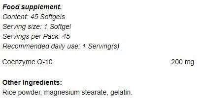Ingredience: Koenzym Q10, rýžový prášek, stearát hořečnatý, želatina