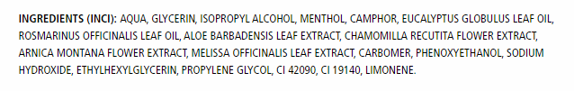 • S mentolem, kafrem, rozmarýnem a eukalyptovým olejem a přírodními extrakty (heřmánek, meduňka, arnika, aloe vera)