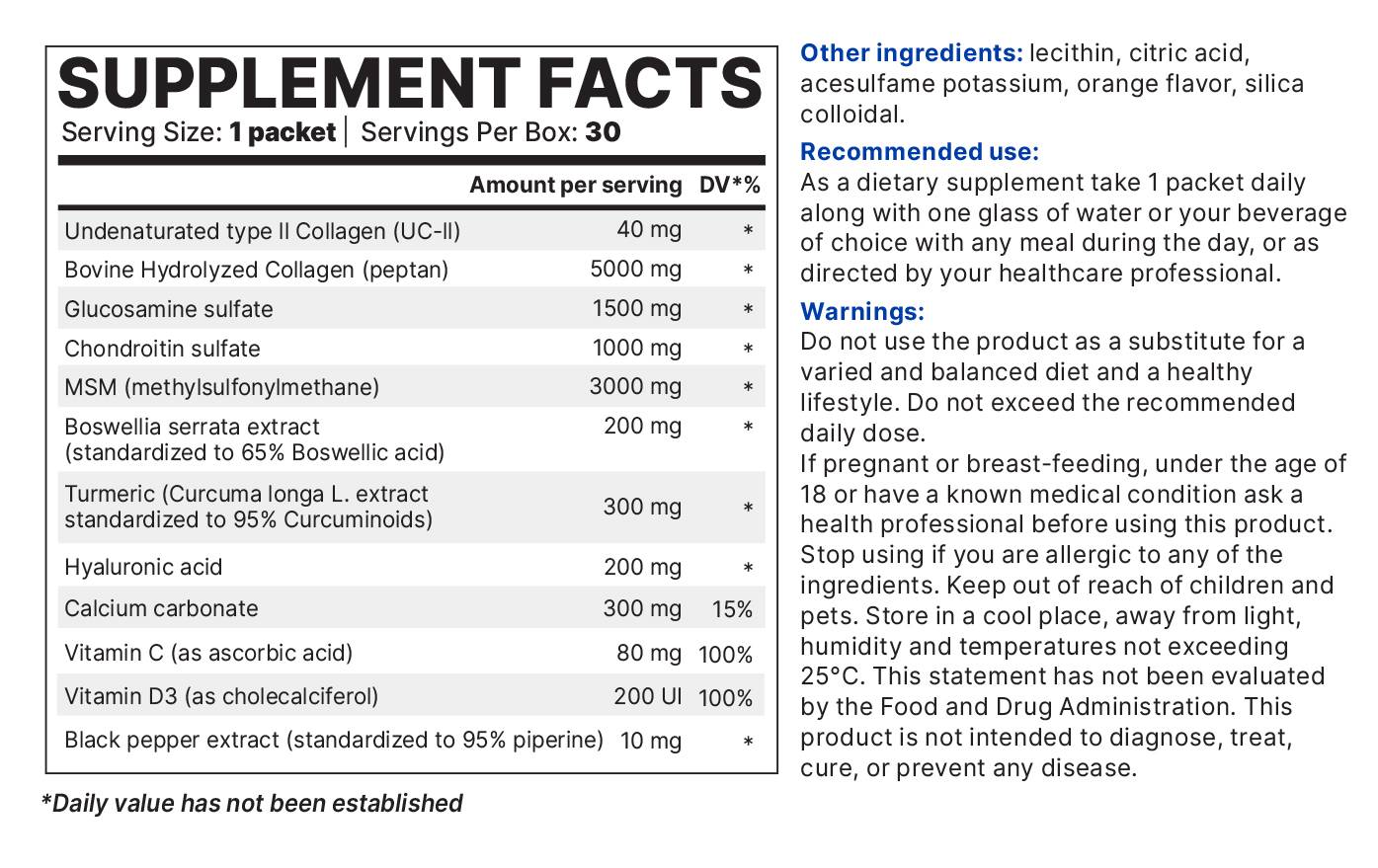 • ✔ Obsahuje nedenaturovaný kolagen typu II (UC-II), bovinní hydrolyzovaný kolagen, glukosamin, chondroitin a MSM pro optimální zdraví kloubů.