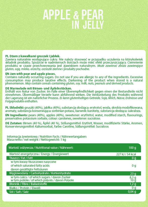 Jelly s příchutí Apple and Pear je vlajkovou lodí značky číslo jedna pro tekuté doplňky výživy. Tento jedinečný produkt nabízí řadu zdravotních výhod. Obsažené přírodní složky napomáhají lepšímu trávení, díky vysokému obsahu vlákniny. Vláknina nejen podporuje střevní peristaltiku, ale také pomáhá vytvářet pocit sytosti.