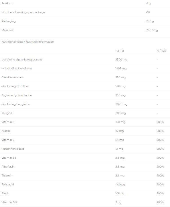 Mezclar 1 dosis (4 g) con 150 ml de agua y beber 30 minutos antes del entrenamiento. Usar en días de entrenamiento. La dosis diaria recomendada es de 4 g.
