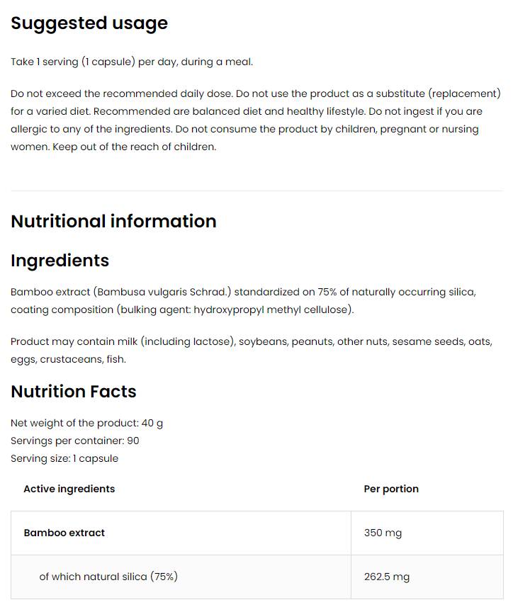 El bambú de sílice es una potente fuente de sílice, esencial para la salud del cuerpo. El sílice desempeña un papel fundamental en el mantenimiento de huesos, articulaciones y tejido conectivo sanos. No solo favorece el crecimiento del cabello y las uñas, sino que también desempeña un papel clave en la producción de colágeno, responsable de la elasticidad y la fortaleza de la piel.