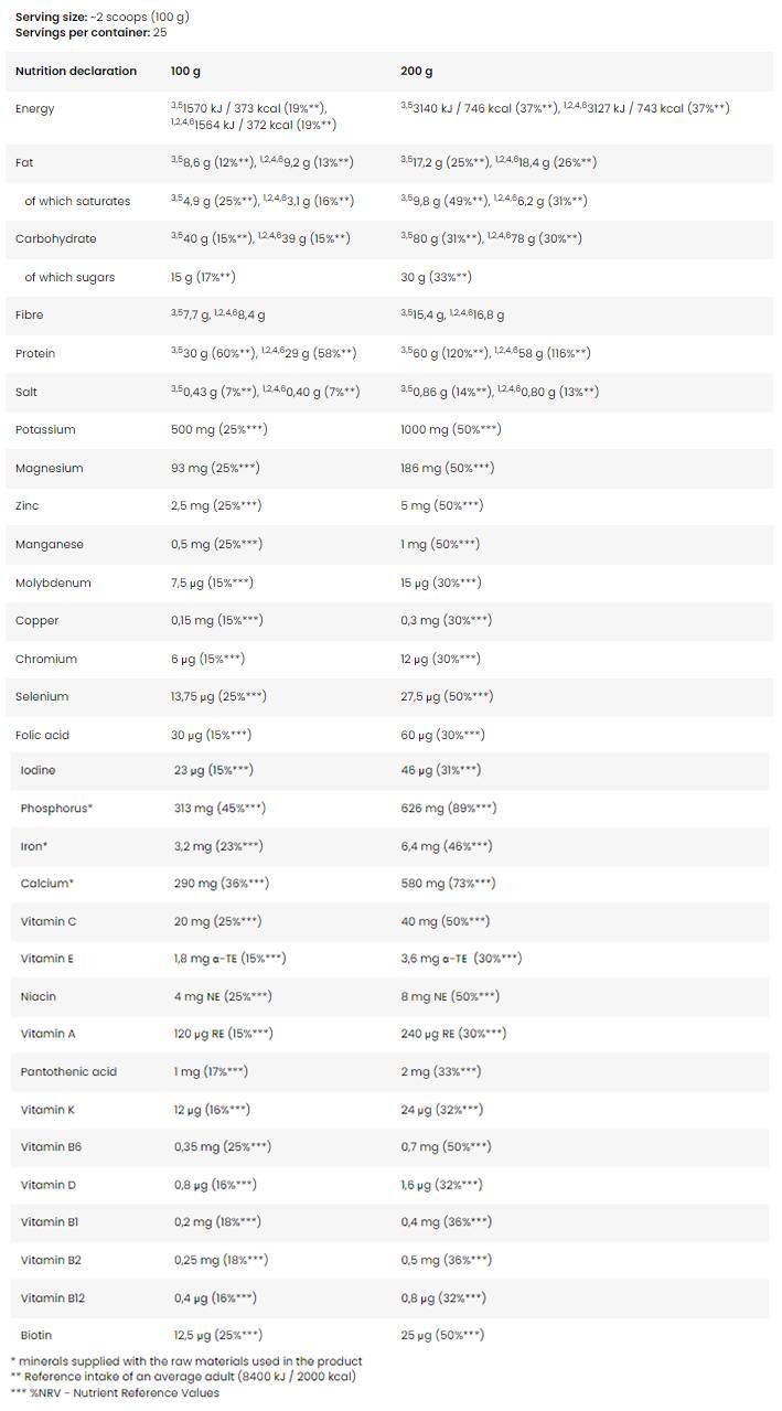 Instrucciones: Tomar 1 o 2 veces al día disolviendo 100 gramos del producto en 300-350 ml de agua, leche o su bebida favorita. Consumir después del entrenamiento para una absorción más rápida de los macronutrientes necesarios para la recuperación.