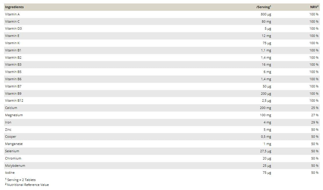 Cada comprimido de VITAMIN AZ te aporta una combinación de 28 vitaminas, minerales y oligoelementos esenciales para tu organismo. Las tabletas son de “liberación prolongada”, i.e... se suministran uniformemente al cuerpo durante un período de horas y se absorben o utilizan de forma óptima.