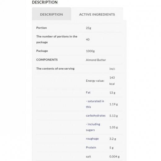 Smooth Almond Cream is ideal for those looking for a healthy alternative to traditional fats. It is rich in unsaturated fats, which have a positive effect on the cardiovascular system, reducing the risk of heart disease. Almonds have been found to be a source of antioxidants and vitamins, which help maintain normal cholesterol levels.