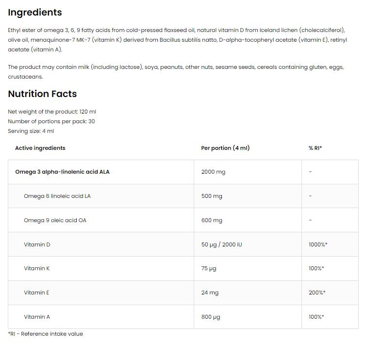 Omega 3-6-9 Liquid is a powerful combination of essential fatty acids and vitamins that play an important role in maintaining optimal health. Vitamins A, D, E and K are essential for the proper functioning of the body, providing cell protection and supporting the immune system. Omega fatty acids play a key role in maintaining a healthy heart and normal brain function. Scientific studies show that regular intake of Omega 3-6-9 can reduce the risk of cardiovascular disease and improve cognitive function.