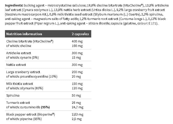 Detoxeed-Pro ™ is a dietary supplement in capsule form containing an advanced formula of plant extracts from: milk thistle, artichoke, stinging nettle, cranberry, turmeric root, black pepper, supplemented with choline and spirulina.