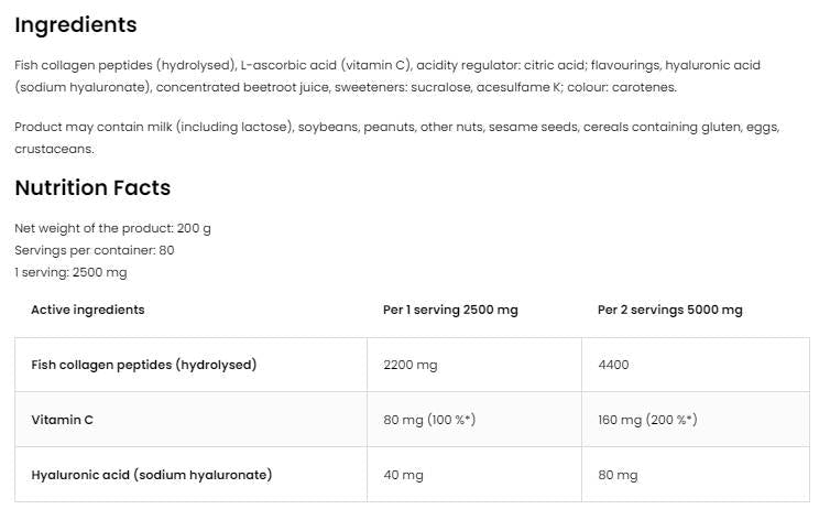Tengeri kollagén és hialuronsav por C-vitaminnal е хранителна добавка, която съдържа колаген от морски източници, хиалуронова киселина и витамин С.