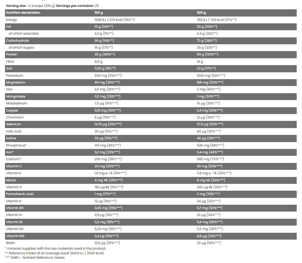 Egy adag 30 g kiváló minőségű fehérjét tartalmaz - tejsavó- és borsófehérje-koncentrátumot