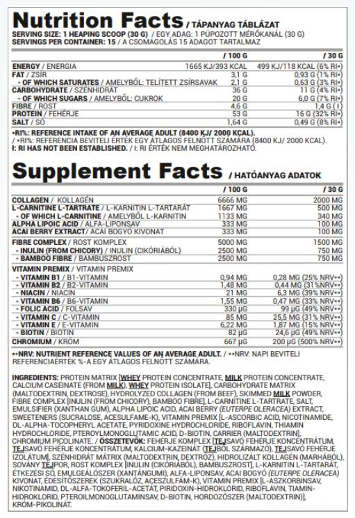 Étkezést helyettesítő turmix, magas fehérje- és rosttartalmú, hozzáadott diétát támogató összetevőkkel kombinálva.