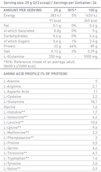 Zutaten: Molkeproteinisolat a Hydrolysat, L-Glutamin