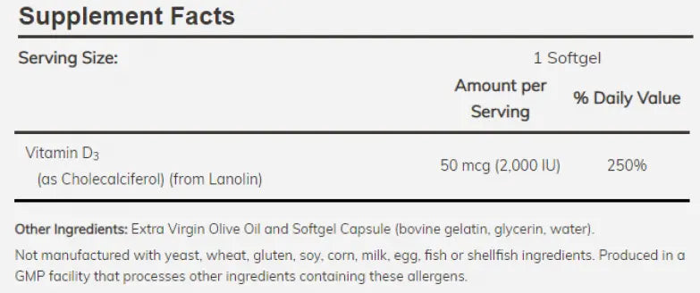 Elo Vitamin D-3 / 2000 IU ass en Nahrungsergänzung mat engem héijen Inhalt vu Vitamin D-3. Et ass e wichtege Participant am Prozess vun der Kalziumsynthese am Kierper, wat vun der gréisster Wichtegkeet fir d'Knachgesondheet an d'Dicht ass.