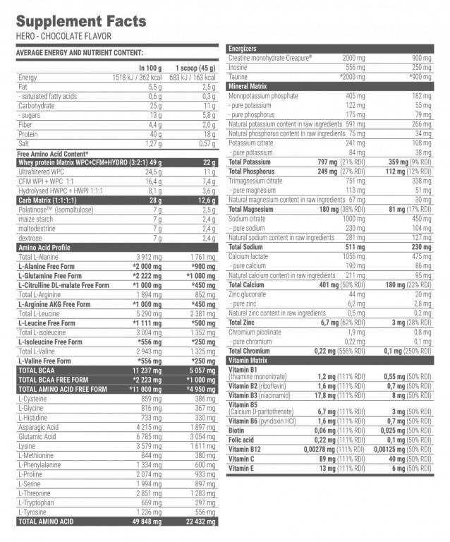 Déi eenzegaarteg Zesummesetzung enthält 37 aktiv Zutaten! D'Benotzung vun HERO nom Training wäert Muskelwachstum a séier Erhuelung förderen.