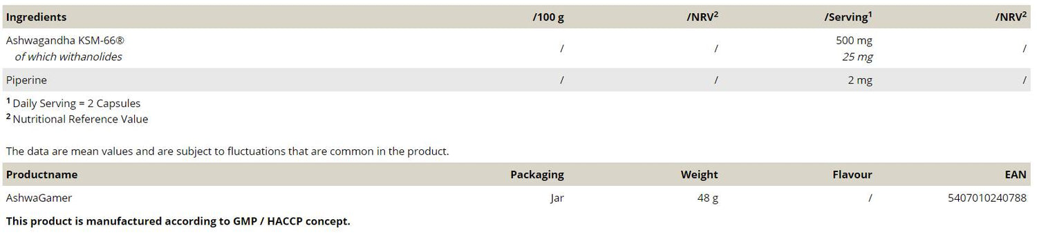 Ashwagamer | Su 500 mg Ashwagandha KSM -66® - 60 kapsulių