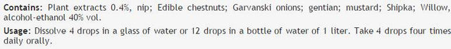 Plant extracts 0.4%: Horsetail; Chestnut; Raven's onion; Gentian; Mustard; Rosehip; Willow