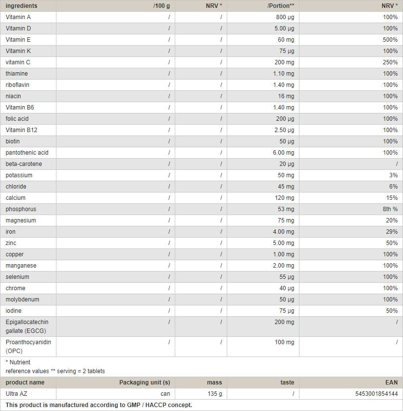 Each ULTRA AZ tablet provides you with a combination of 30 essential vitamins, minerals and trace elements for your body, as well as polyphenols such as EGCG and OPC (their antioxidant effect is much greater than that of pure vitamins). The tablets are "time-released", i.e. they are evenly supplied to the body over hours and are optimally absorbed, or utilized. Taking 1 tablet twice a day, respectively in the morning after waking up and in the evening before going to bed, covers the minimum required amount of Vitamins per day for the normal user [100% RDA (Recommended Dietary Allowance) for 24 hours].