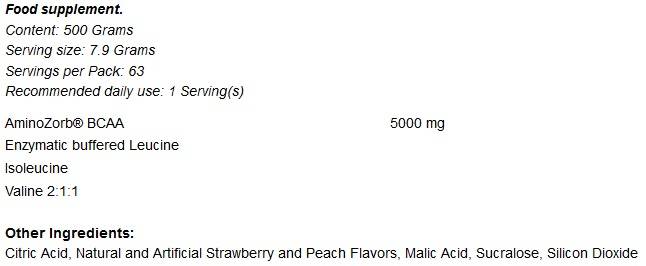 AMINOZORB BCAA is een hoogwaardig voedingssupplement dat een ideale balans biedt van vertakte-keten aminozuren (BCAA) - leucine, isoleucine en valine. Deze aminozuren spelen een belangrijke rol bij de spierstofwisseling, vooral tijdens intensieve fysieke inspanning. Wetenschappelijk onderzoek toont aan dat BCAA's het herstel na de training kunnen versnellen en spierpijn kunnen verminderen. Hierdoor verbeteren de trainingskwaliteit en de sportprestaties.