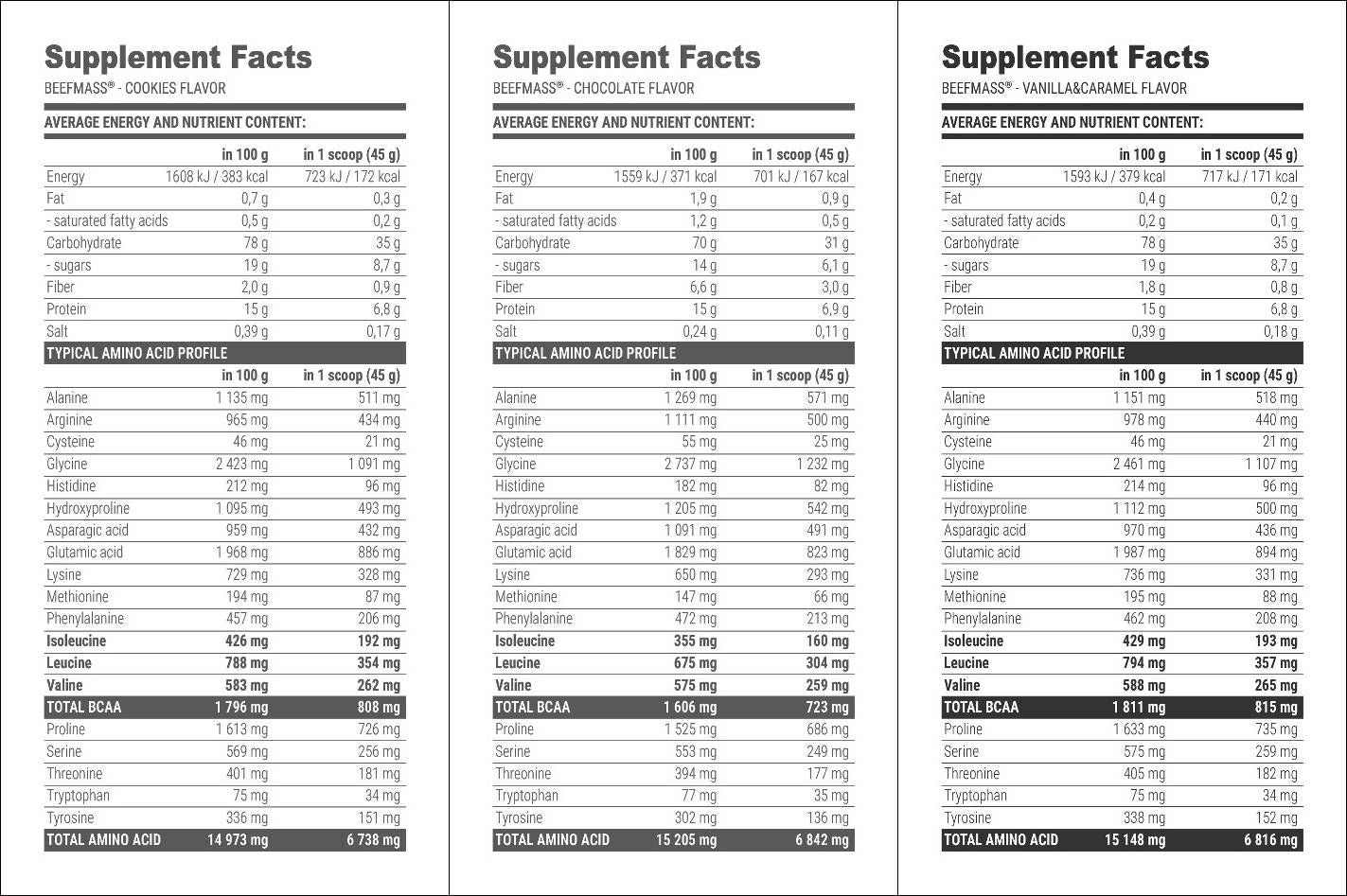 Het merkproteïne-isolaat HydroBEEF® (gehydrolyseerde rundvleespeptiden) met 97% rundvleesproteïnegehalte vormt de basis van onze BeefMass® gainer. Voor maximale spiergroei en meer uithoudingsvermogen hebben we een hoogwaardige koolstofmatrix toegevoegd. BeefMass® is een nieuwe gainer die gehydrolyseerd rundvleesisolaat bevat met vrijwel geen vet en suiker. HydroBEEF® rundvleesproteïne-isolaat is een van de beste eiwitbronnen. Krachtsporters eten al heel lang rundvleeseiwitten. BeefMass® is ontworpen voor iedereen die spiermassa, kracht en resultaten in de sportschool wil vergroten.