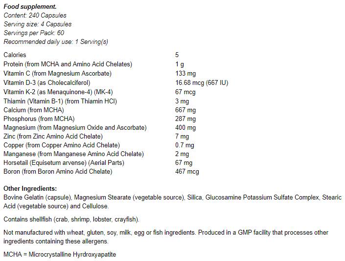 NOW® Wzmocnienie kości zawiera mikrokrystaliczne Hydroksyapatyt (MCHA) – całkowicie naturalny składnik budujący krystaliczną strukturę kości i zębów. MCHA jest źródłem wysoce przyswajalnych minerałów wapnia i fosforu, które są głównymi elementami strukturalnymi kości. NOW® Bone Strength™ zawiera pierwiastki śladowe oraz witaminy C, D i K, które biorą udział w procesach budowy i odnowy tkanki kostnej.