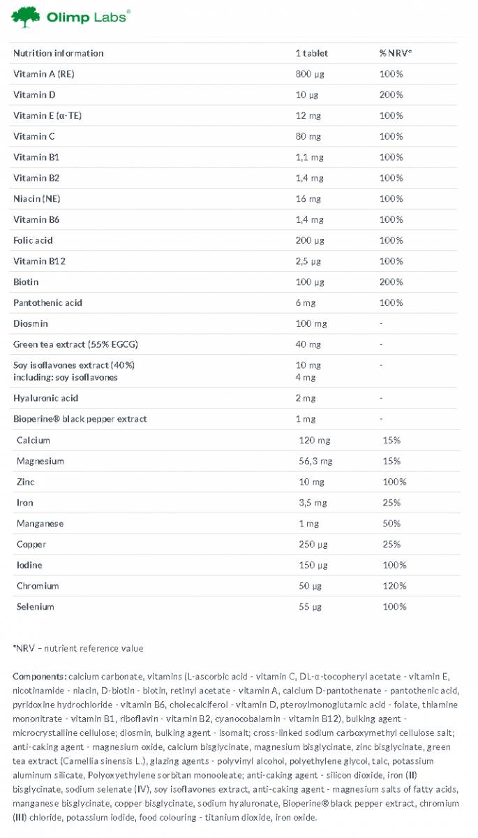 Formułę uzupełniono o izoflawony sojowe, ekstrakt z zielonej herbaty, kwas hialuronowy i diosminę, a także Bioperyna ® ekstrakt z czarnego pieprzu.