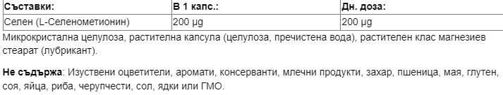 Selen z naturalnego źródła w postaci L-selenometioniny lub Se-Met – naturalnego aminokwasu, który w porównaniu do innych form selenu jest znacznie łatwiej wchłaniany i dłużej utrzymuje się w organizmie. Skład Selenu (L-selenometioniny) jest certyfikowany przez ISURA, co gwarantuje brak GMO, pestycydów, rozpuszczalników itp.! Z certyfikatem GFCO, że nie zawiera glutenu. Z oznaczeniem NPN (Numer Produktu Naturalnego) – licencjonowany i oceniony jako bezpieczny, skuteczny i wysokiej jakości przez Health Canada!