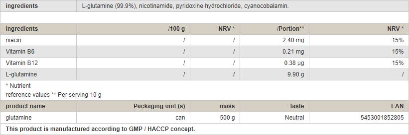 Directions for use: L-Glutamine - 10 g (about 1 tablespoon) dissolved in liquid, best immediately after training.