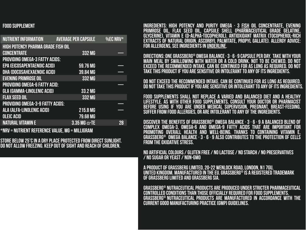 Grassberg Omega 3-6-9 Balance 1000mg is a combination of essential fatty acids for our health. Each of the three fatty acids has benefits for our health, but it is important that omega 3, 6 and 9 are in the right balance. It contains a well-balanced dose of the three beneficial unsaturated fatty acids and vitamin E.