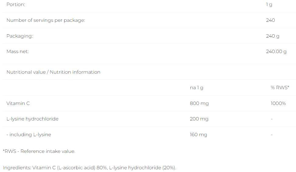 Vitamina C + L-Lisina em Pó - 240 gramas