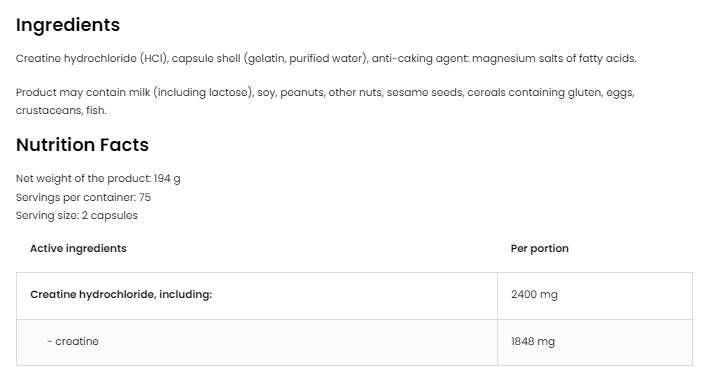 Creatine hydrochloride has an anabolic effect, helps build lean muscle mass and increases strength and body efficiency. It supports the process of reducing fat tissue, increases training efficiency, accelerates muscle regeneration after training and delays the effects of fatigue.