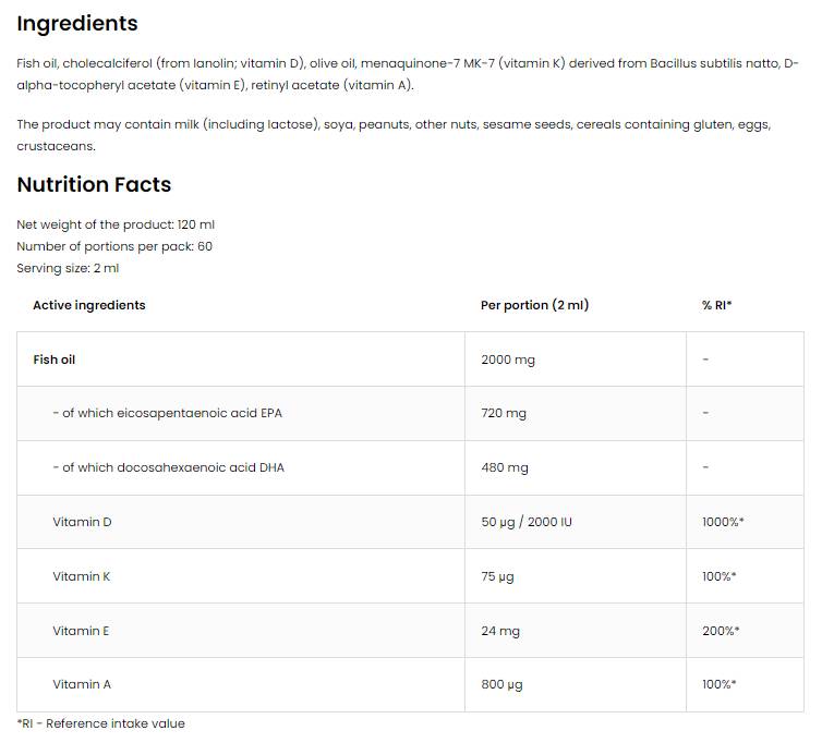 O ômega 3 líquido com vitaminas A, D, E e K adicionadas proporciona cuidados completos para sua saúde. Este produto é extremamente benéfico para o coração, o cérebro e o sistema imunológico, fornecendo os nutrientes necessários para o funcionamento ideal do corpo. Os ácidos graxos ômega 3 contribuem para o funcionamento normal das células e reduzem os processos inflamatórios no corpo, o que é essencial para a saúde geral.