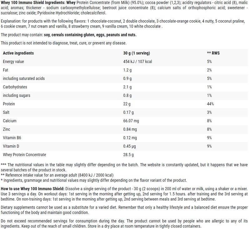 100% do seu conteúdo é concentrado de proteína de soro de leite com uma pureza de concentração de mais de 80%. A proteína do soro do leite está entre as proteínas naturais mais populares e eficazes. Possui alto valor biológico (BV104), ótima solubilidade e absorção, além de quantidade significativa de aminoácidos de cadeia ramificada (BCAA) e glutamina.