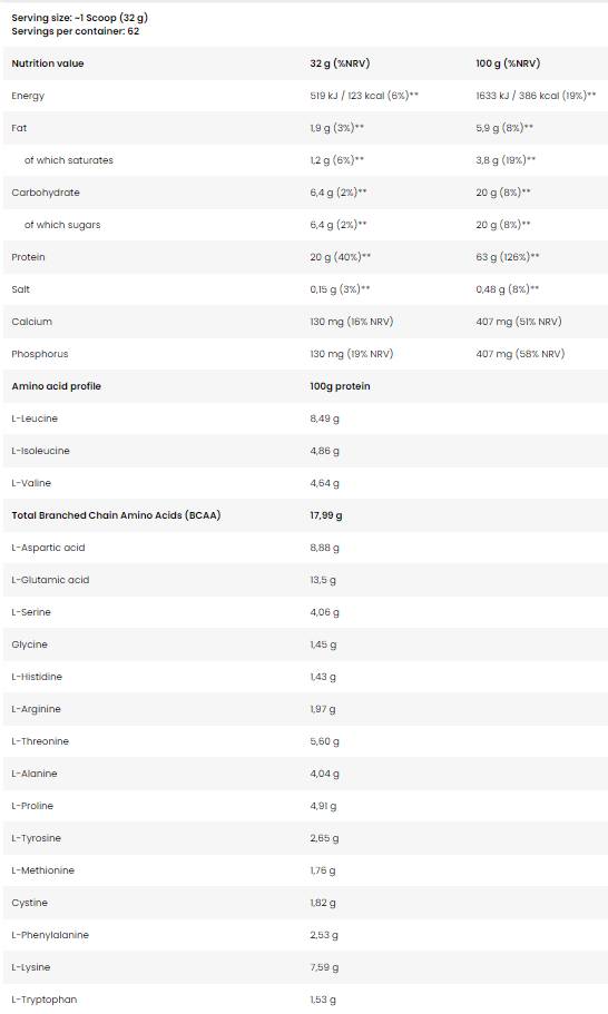 Proteína de soro de leite FA contém uma grande quantidade de proteínas, aminoácidos de cadeia ramificada (BCAAs) e L-glutamina. Esses são os ingredientes mais importantes para um suplemento nutricional adequado para todos os atletas. Os minerais adicionados — cálcio e fósforo — também auxiliam na função muscular e no metabolismo normais. Em Proteína de soro de leite Ele também contém enzimas digestivas que têm um efeito benéfico nos neurotransmissores do corpo e participam do processo de divisão celular.