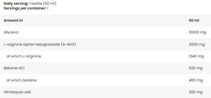 Ingredients: water, apple juice from apple juice concentrate (20%), glycerol, L-arginine alpha-ketoglutarate (A-AKG), betaine HCl, Himalayan salt, acid (citric acid), flavors, sweeteners (acesulfame K, sucralose, neotame), preservatives (potassium sorbate, sodium benzoate), maltodextrin.